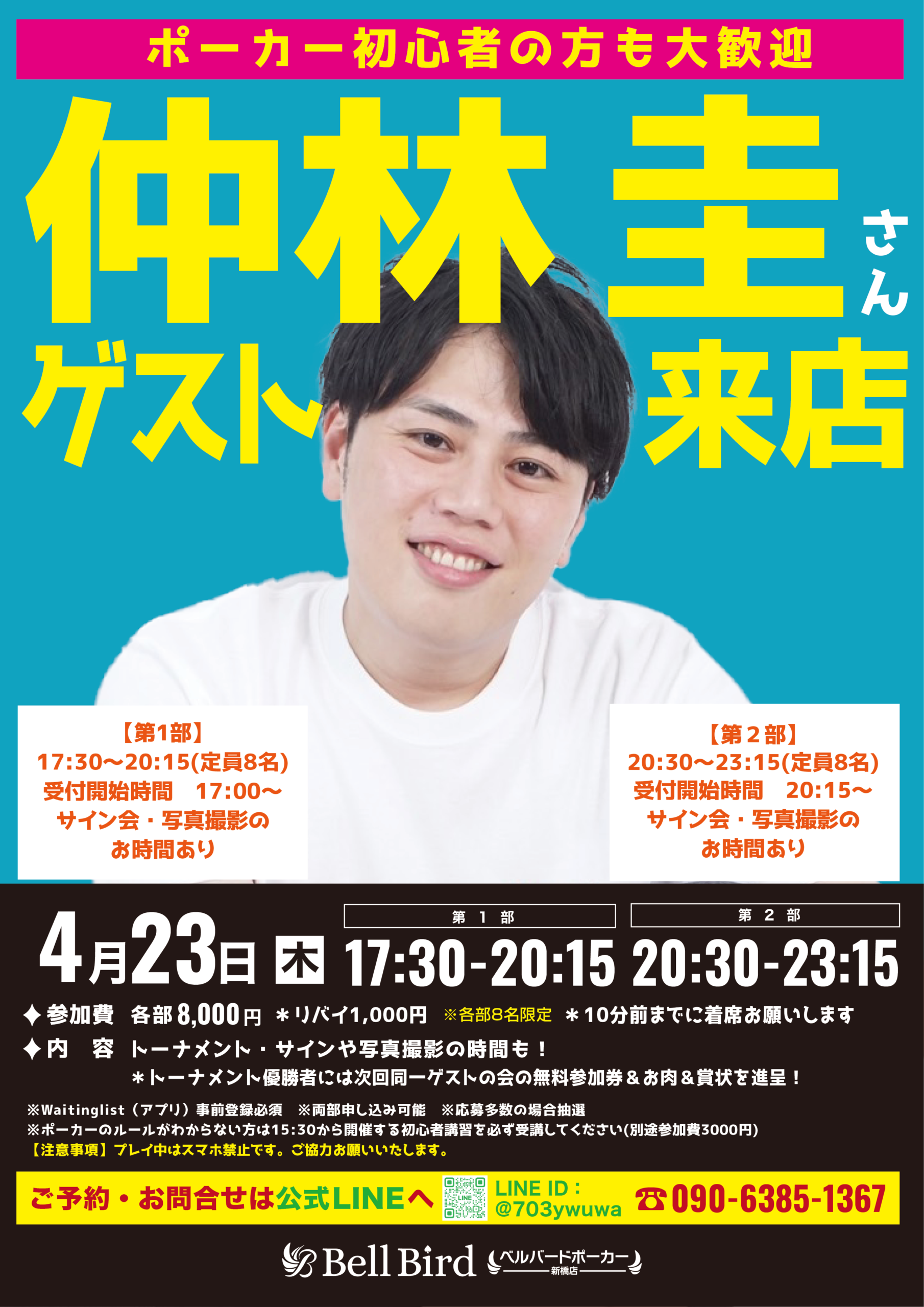 日本プロ麻雀協会・MリーグU-NEXT Pirates 仲林圭プロがベルバードポーカー店にゲストとしてご来店いただきます✨